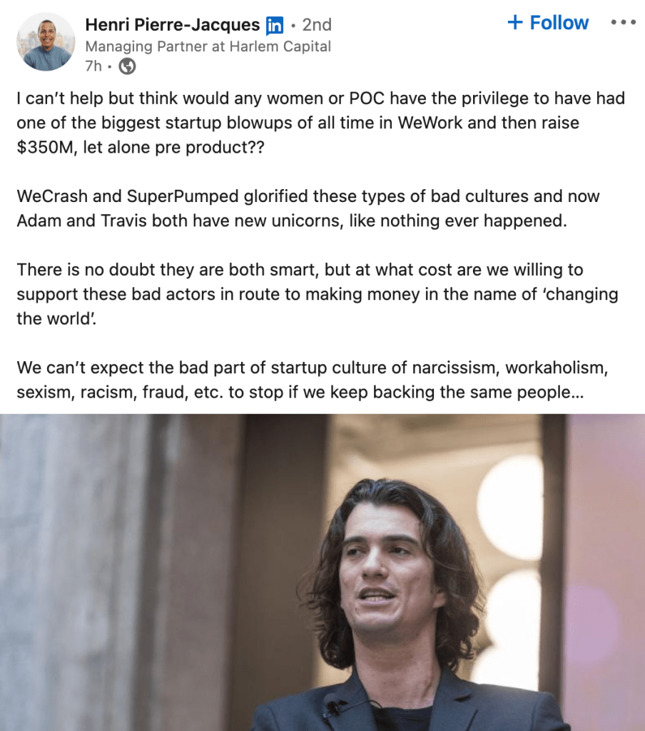 People seem skeptical at best, angry at worst about Adam raising this much money so soon after WeWork’s flop – its loss of value for shareholders and toxic employee culture of sexism. (I often find it challenging to succinctly summarize the misdeeds of people in positions of power who also happen to be white men, so if you have a better summary, feel free to leave a comment.)