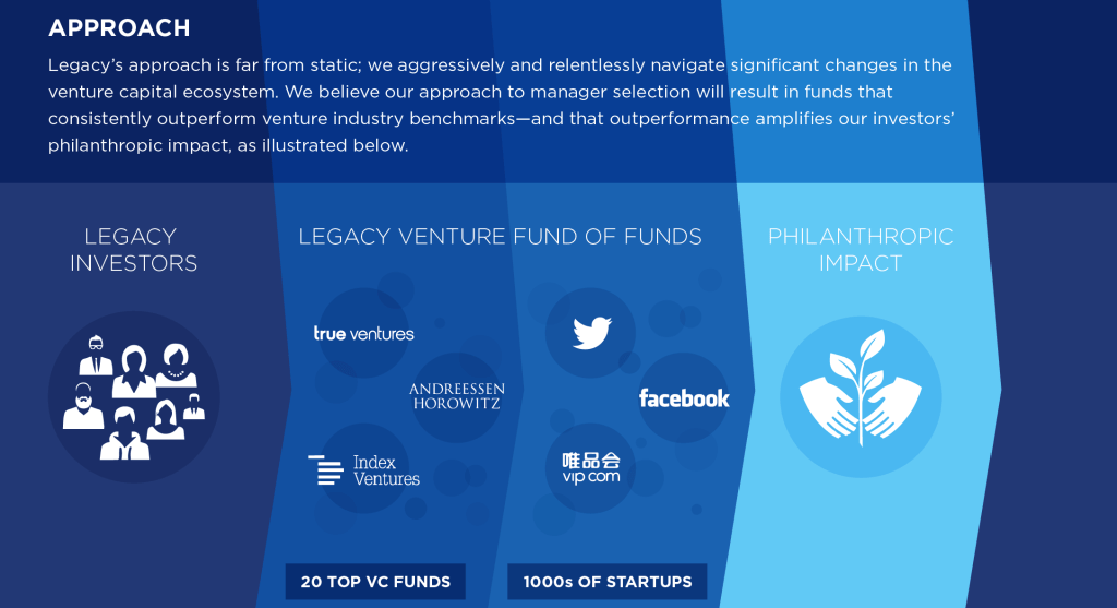 - Legacy then invests in VC funds (such as Andreessen Horowitz, True, and Index, and Accel)
